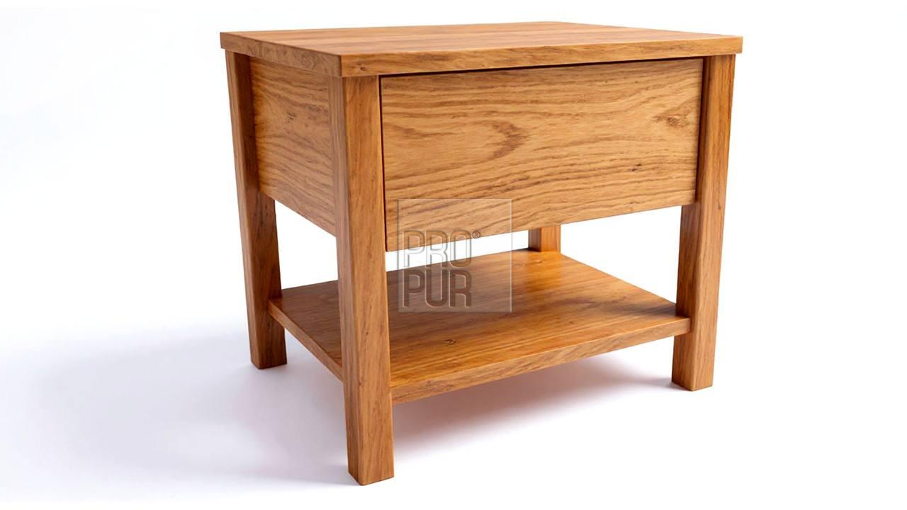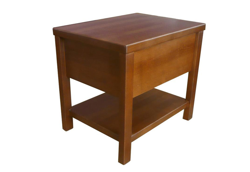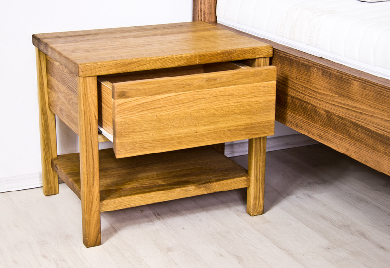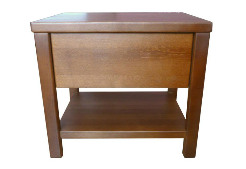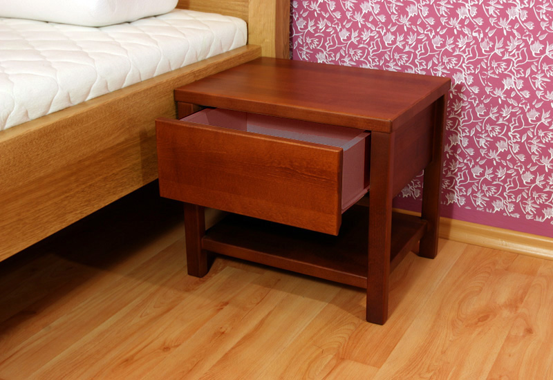 Noční stolek z masivu DELICIA, 1x šuplík na nožkách+ spodní polička. Základní rozměry š.50 x hl.40 cm a výška stolku je 45 cm. Design nočního stolku přizpůsobujeme k designu vybrané postele. Noční stolky jsou vyráběny z masivního dřeva, vnitřní části šuplíků a záda jsou z lamina v dekoru vybrané barvy a druhu dřeva. Pojezdové kování je rolničkové od hettich, s příplatkem je na žádost možné zvolit i jiné kování. Na šuplíku lze zvolit druh úchytky, madla jsou z kolekce ProDecor od Hettich s doživotní zárukou. Provedení masiv Buk, nebo za příplatek Dub, Jasan.