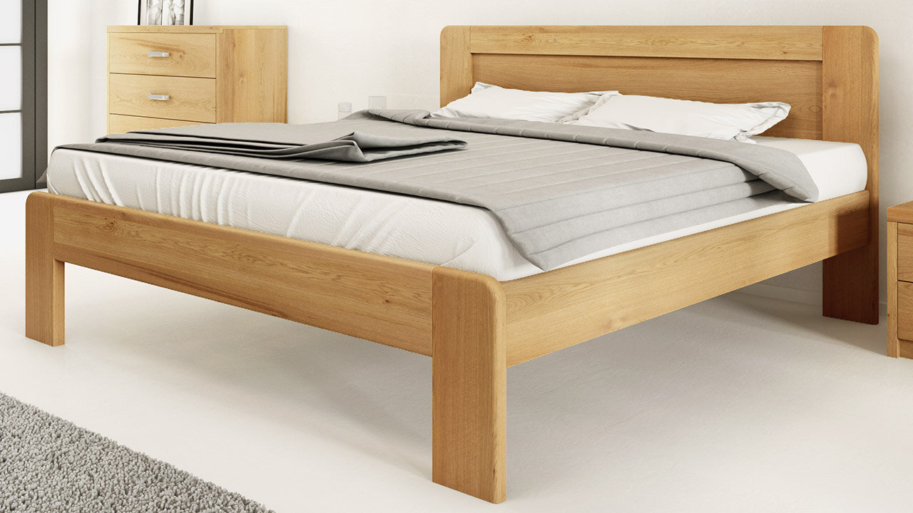 Postele z masivu SISI DUB je elegantní dubová postel se zaoblenými hranami a rohy na čelech, u které si můžete zvolit výšku hlavového čela. Šíře masivu je u bočnic i čel postele 3,7 cm. Základní výška hlavového čela postele je 90 cm, s příplatkem lze zvolit výšku čela 100 cm. Výplň hlavového čela tvoří deska z masivní dýhy.